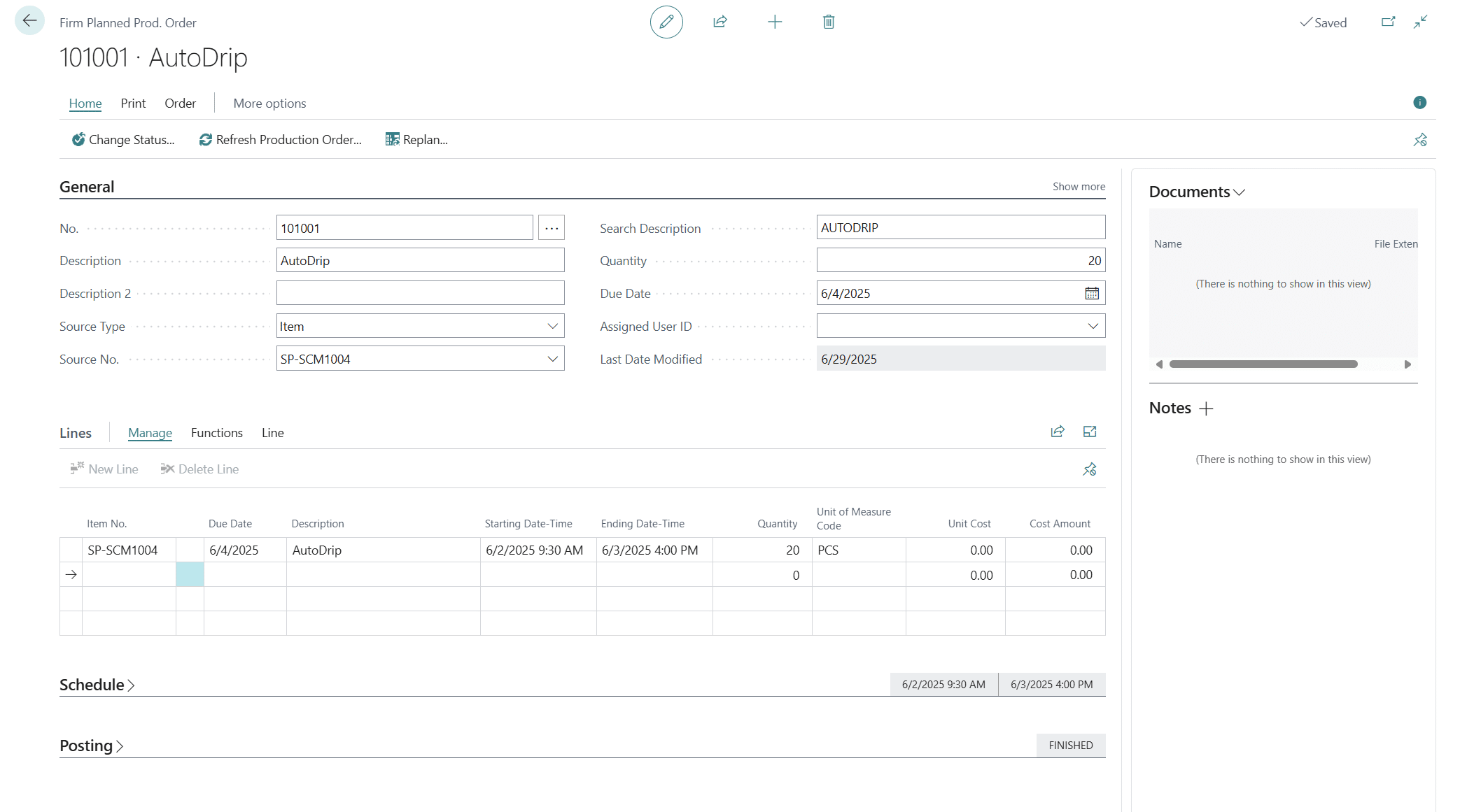 Production orders bring your plans to life. These can be generated manually or automatically using Business Central’s built-in Material Requirements Planning (MRP) tool. MRP reviews forecasts, inventory, and lead times to recommend when and what to produce, helping manufacturers align production schedules with real demand.
