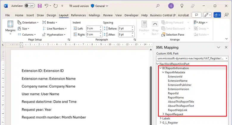 - Expanded Word layout functionality for reports: Similar to Excel layouts, Word layouts now can access reports and request metadata, so you can customize reports without modifying the data set. This simplifies report creation by providing structured metadata such as report name, object ID, company name, and request details within Word, so you don’t have to enter data manually.