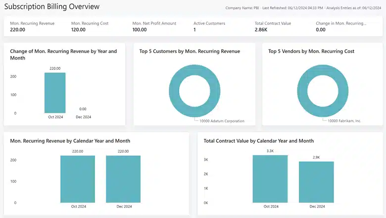 The 2025 release wave 1 of D365 BC introduces a new Power BI app to help you dive deeper into your subscription billing data. This app has reports and KPIs to help you track essential metrics such as Monthly Recurring Revenue (MRR), Net Monthly Recurring Profit, and customer deferrals. With these insights, you can optimize sales, marketing, and cash flow management and grow your subscription business.
