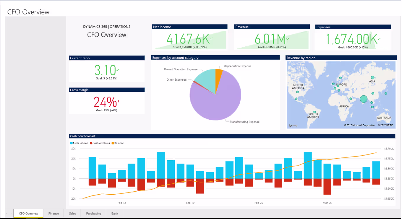 The CFO dashboard is designed to provide executive-level visibility across financial and operational performance. In Dynamics 365 Finance & Operations, the CFO overview workspace combines data from financial performance, cash management, sales, and purchasing into a single executive view. This supports faster, data-driven decision-making at the leadership level.