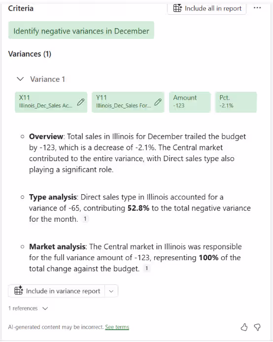 - Draft variance explanations: Copilot can generate plain-language summaries of favorable and unfavorable variances that finance teams review and refine for management reporting. This improves consistency across reporting periods while reducing time spent writing commentary.
