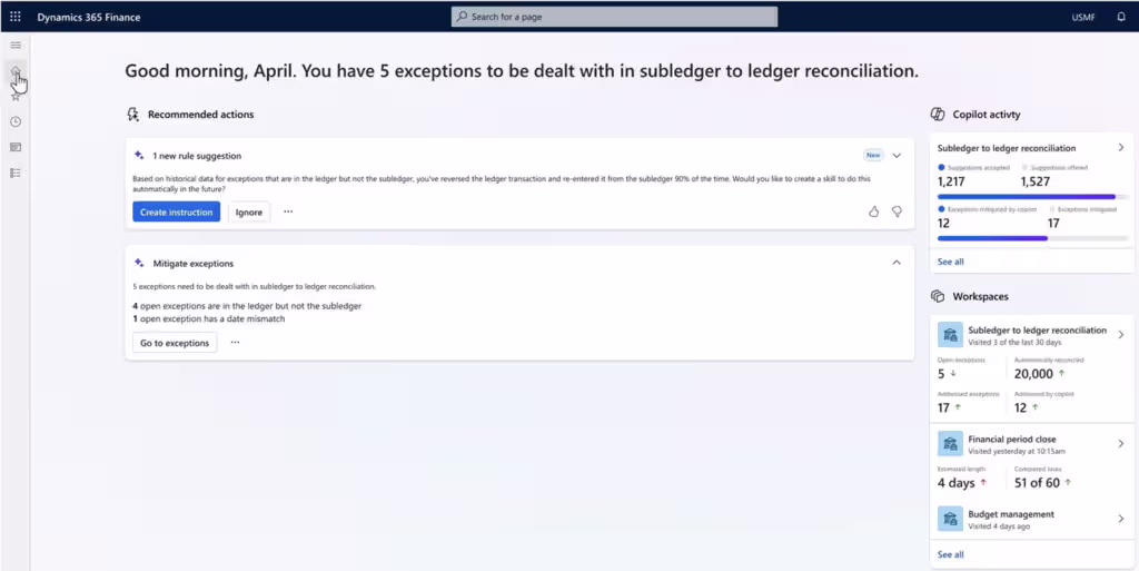 The account reconciliation agent focuses on automating and streamlining the reconciliation process for high-volume accounts. It analyzes transactions, identifies matching entries, and flags discrepancies that require review. By working directly within Dynamics 365 Finance & Operations, the agent helps finance teams close periods faster while maintaining control and auditability. This reduces reliance on manual matching and spreadsheet-based reconciliations.