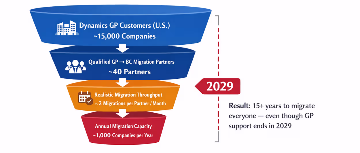There are an estimated 15,000 companies in the U.S. still running Dynamics GP, but only about 40 qualified partners with deep experience executing GP to Business Central migrations at scale. With an average capacity of 2 migrations per partner per month, the entire ecosystem can complete roughly 1,000 migrations per year.