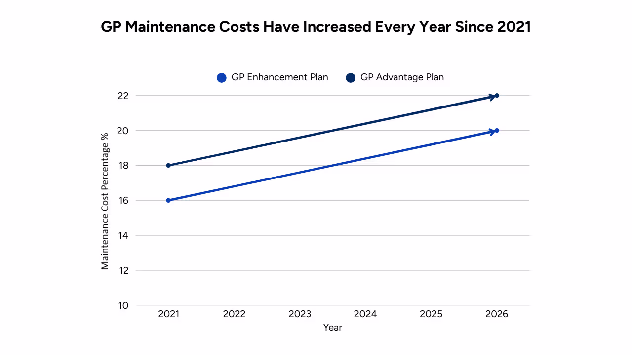 - Rising maintenance costs: Enhancement Plan costs increased from 16% in 2021 to 20% in 2026. Advantage Plan costs increased from 18% to 22% over the same period.