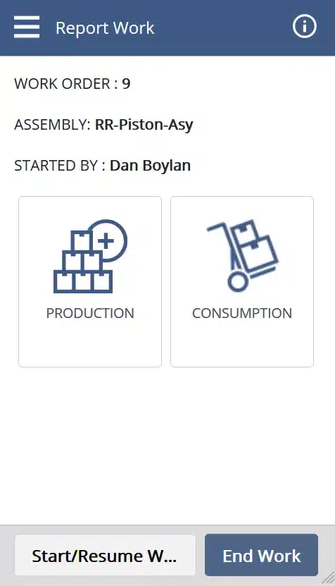 - Pause and restart capabilities: Users can pause and restart operations multiple times, with the option to charge or not charge pause durations to the work order, depending on predefined reason code settings.