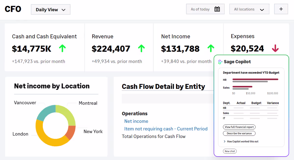 Sage Intacct AI delivers insights across financial workflows. Copilot generates plain-language summaries, highlights budget variances, and surfaces trends finance leaders need to make informed decisions.