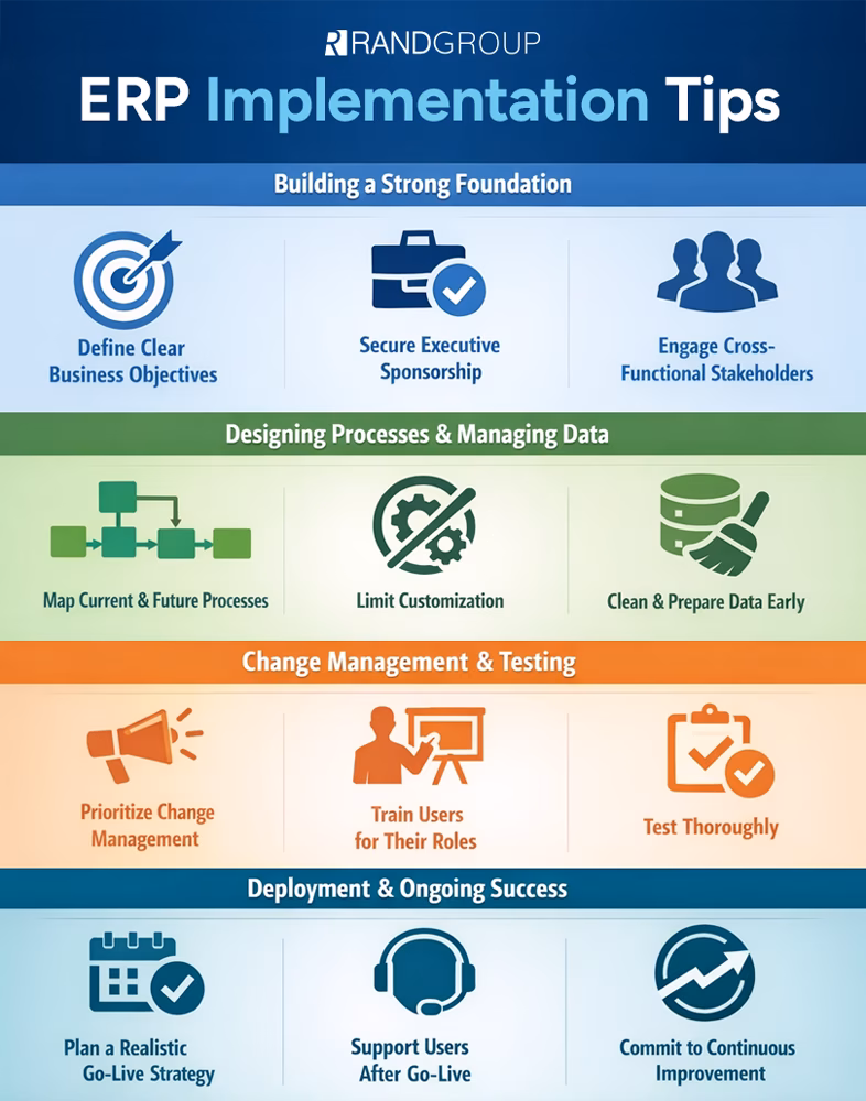 Because ERP implementations are complex, organizations must approach them with a clear strategy, disciplined execution, and the right expertise. This blog outlines proven ERP implementation best practices, along with practical ERP implementation tips, to help organizations reduce risk, improve adoption, and achieve long-term success. We’ll also cover how to recognize when an implementation is struggling, what to do if it has failed, and how Rand Group helps organizations implement ERP solutions that support real business outcomes.
