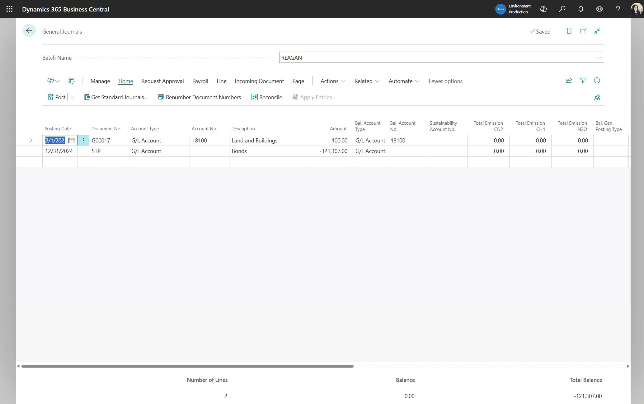- Enter key details like Batch Name, Document No., Posting Date, and Currency Code at the journal header level. Once this data is entered on the header, it will default on the lines, reducing the amount of redundant data entry.
