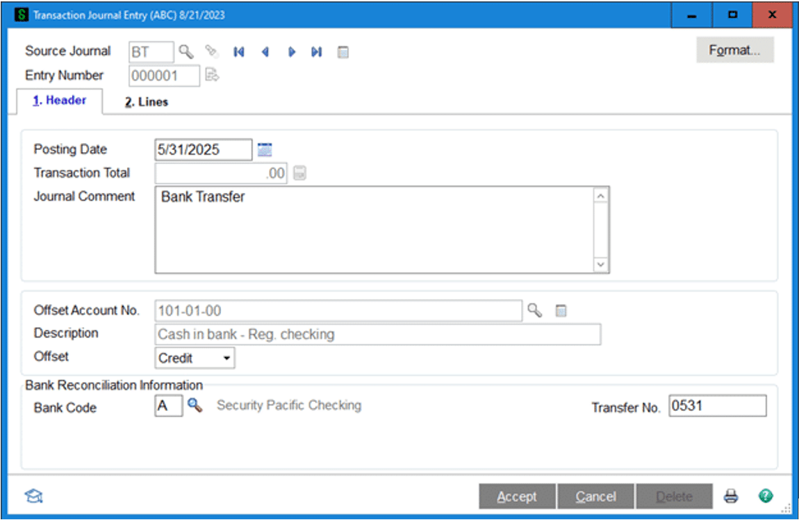 Once your format is set and the header information is complete, you can continue to the Lines tab to enter the debit and credit amounts for the source and destination bank accounts, then update the journal to post your transfer.