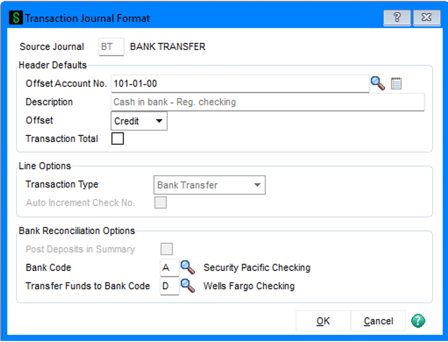 - Review or adjust these settings to ensure your transfer entry reflects the correct bank accounts and posting details.