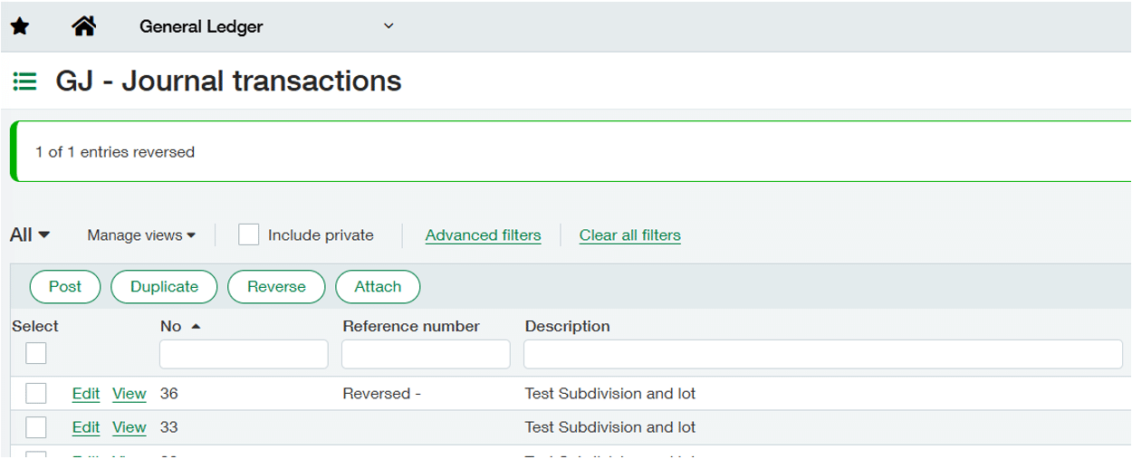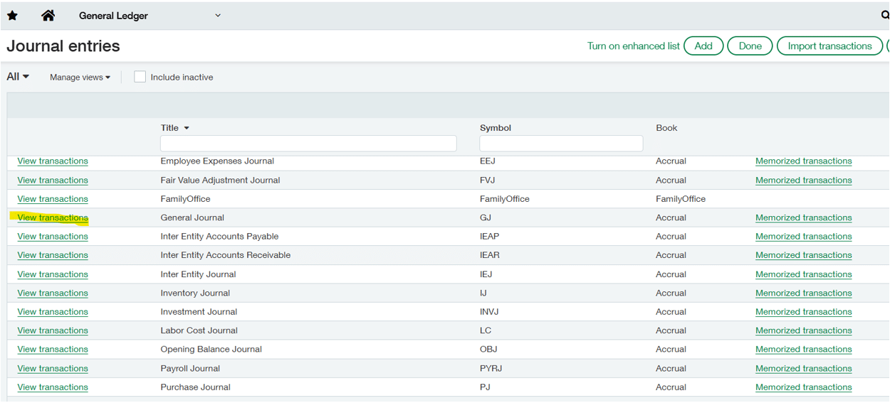 - The list of journals will appear on the screen, find the journal the transaction is currently in and click on “view transactions” for that journal. Manual journal entries are usually entered into the General Journal.
