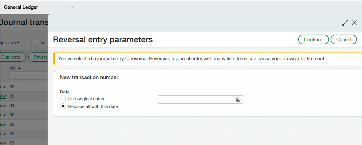 - A new box will open up asking you which date you would like to use for the reversal – you can use the original posting date or replace with a new date that you enter. Then click “Continue” at the top.